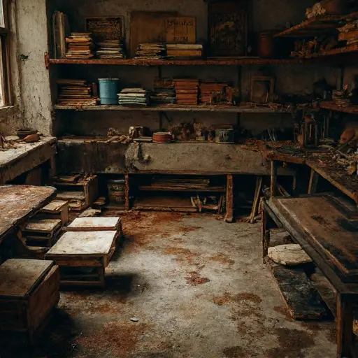 The Atelier is heavy with stillness, marked by frozen routine. Here, the ledger plate commanded attention: each line measured, each cross-hatching deliberate. Burins lie at rest beside plates, and paper rests stacked in careful order.