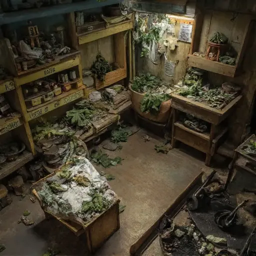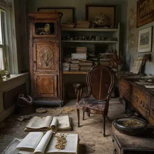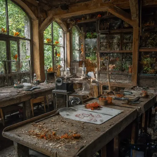 The Botanist’s Conservatory breathes a silent green. On a table, penciled herbarium notes trail off abruptly. Every jar, tweezers, and magnifying glass embodies precise labor abruptly paused, the rhythm of plant study suspended in quiet stillness.