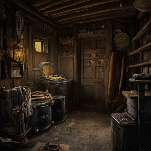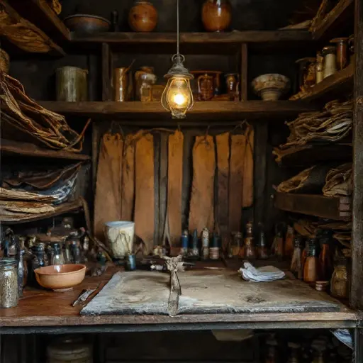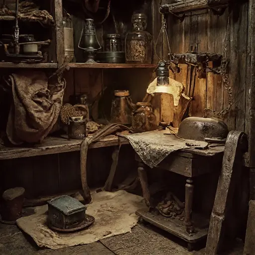 Behind stacked hides lies a returned note—“uneven seam.” A strap shows faint impressions from repeated adjustments. Sipho’s stool stands skewed toward the door, as though rising to reconsider each decision. A mallet rests on its side, handle warmed by recent use. A trail of wax flakes arcs across the floor, marking hesitant pacing. Even the lantern wick burns slightly lopsided, as if echoing the unsettled work below.
