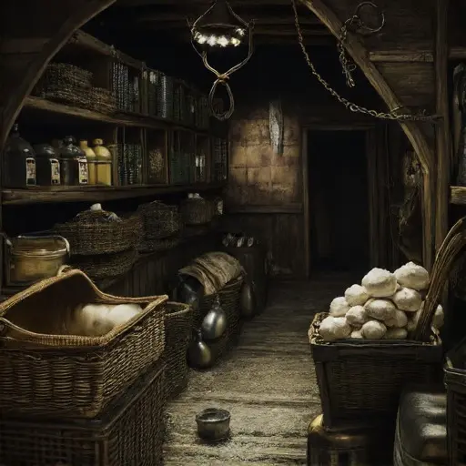 But subtle disturbances crept in. A jar of honey lies tipped, crystallizing in hardened drips along the shelf. A dough bowl, normally wiped clean, shows caked remnants, as if interrupted mid-preparation. The iron hooks above the table sway slightly out of alignment, not broken yet unsettlingly skewed. A ledger of supply orders, once meticulously kept, now shows lines crossed out in confusion, totals rewritten, then abandoned.