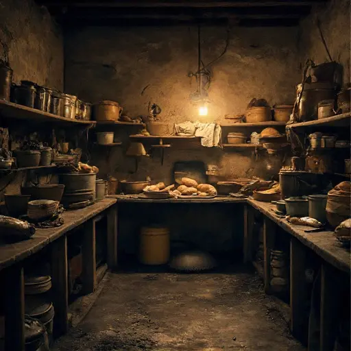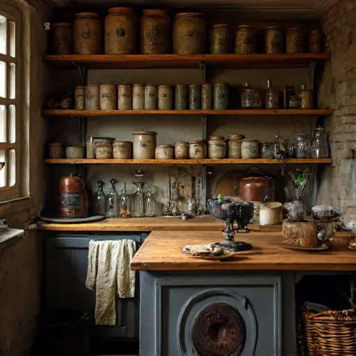 The pantry smells faintly of flour and old citrus peel, a scent that clings to the gaps between shelves like an unfinished sentence. Soft grit dusts the floorboards, gathering under the churn as though swept there in haste. A faint rattling comes from a loose lid atop a jar of barley, disturbed only when the house settles.
