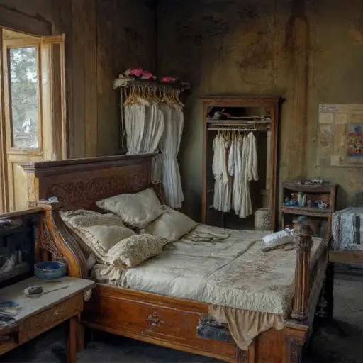The house remains abandoned, looms, threads, and textiles waiting in stillness, the quiet heavy with unfinished craft and lost mastery.