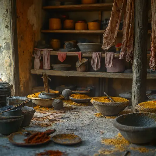The Weaver’s Hall resonates with suspended rhythm. On a loom, penciled warp notations for a ceremonial rug end abruptly. Every spool, shuttle, and frame implies disciplined practice abruptly halted, the careful routine frozen mid-motion.