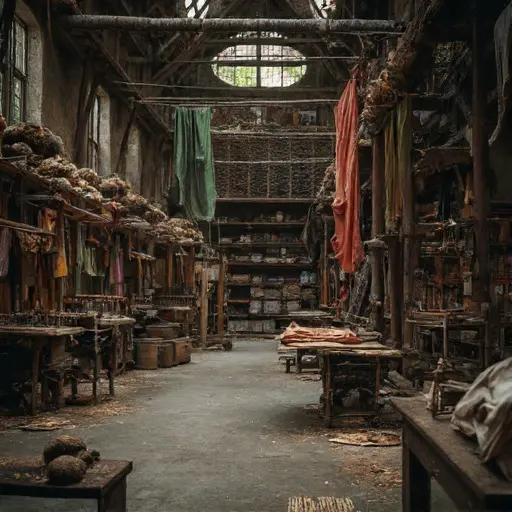 Looms hold partially woven textiles. Spools of silk and cotton thread are arranged by color, some fraying at the edges. Bobbins, shuttles, and brushes are scattered, stiff with residual dye. Anika’s ledger, under a small wooden weight, details client names, patterns, and intended use. Dust and residual fibers highlight the sudden cessation of repeated, patient gestures.