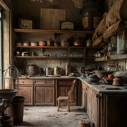 The house remains abandoned, its counters, molds, and recipe scrolls a silent testament to interrupted sweetness and suspended craft, frozen in the faint lingering aroma of cocoa and sugar.