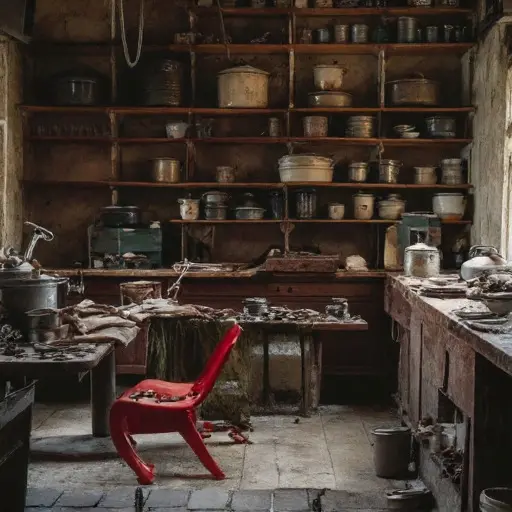 A muted stillness fills the Pantry, where sugar sifters lie upright, and chocolate molds are stacked neatly yet untouched. Every utensil and jar hints at routines halted abruptly, as if the room itself remembers the precise motions that once shaped it.