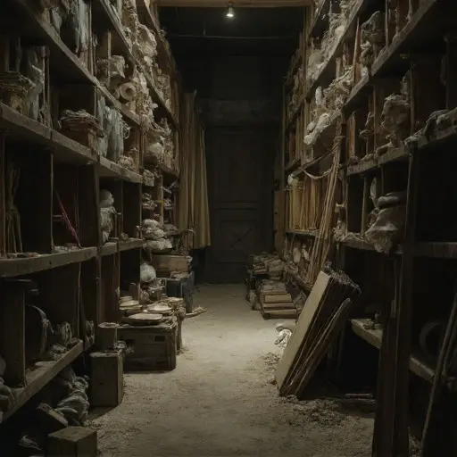This upholstery hall retains the careful artistry of Aimé Laurent Rousseau, upholsterer and furniture restorer, born 1871 in Lyon. Raised among modest artisans, he brought the discipline of guild work into this residence. His tools show it: shears sharpened to a whiskering shine; upholstery needles bound in ribbons; tack hammers arranged by weight. A lavender sachet from his sister, Marie-Claire Rousseau, rests atop a chest of trims, its fabric yellowing at the corners.