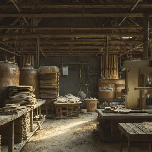 The papermill loft hangs in suspended stillness. On the central vat, a half-formed sheet rests on the deckle, its pulp notes left unfinished. Tools and molds lie scattered yet carefully positioned, with pulp stains frozen mid-splatter, evidence of interrupted labor rather than neglect.
