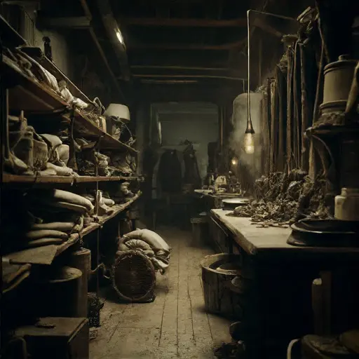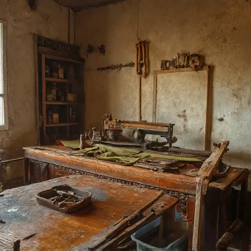 The room feels caught between breaths—fabric dust rising from each step, chalk lines ghosting across the tables, shears gleaming in unmoving vigilance. A single half-tailored waistcoat lies folded wrong-side-out, its lining bunched as though abandoned mid-adjustment. Nothing here shouts; everything mutters of a precision that thinned, a confidence that frayed, a quiet work abandoned for reasons never fully uncovered.
