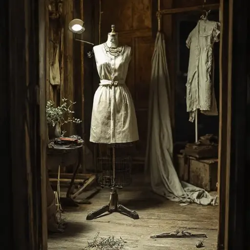 A loose panel beneath the largest cutting table slides back with gentle pressure. Inside rests a rolled bundle of muslin. When unfurled, it reveals a perfectly drafted jacket pattern—precise, balanced—but the final seam line is missing entirely, left blank as though awaiting a decision he could not bring himself to draw.