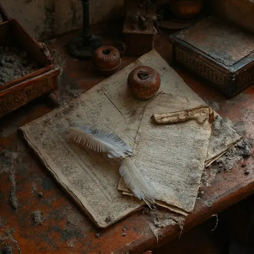 The piano holds half-composed pieces, scattered quills, and ink pots. Harp strings lie slack, music stands carry half-written scores. Giovanni’s sketchbooks, weighed down by small bronze weights, detail melodic lines, chord progressions, and tempo annotations. Dust settling over implements emphasizes abrupt cessation of repeated, precise gestures, silence accentuated by incomplete compositions and misplaced instruments.