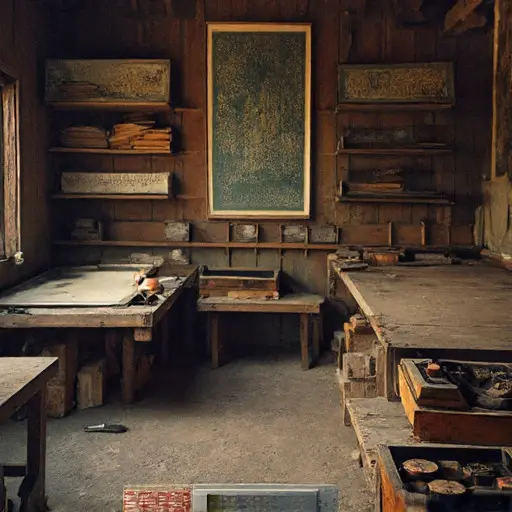 The Printmaker’s Alcove breathes with suspended artistry. On a table, penciled registration notations for a woodblock print trail off unfinished. Each stencil, sheet, and tool speaks of exacting work abruptly paused, the ritual of repeated presses frozen mid-motion.