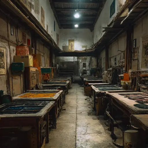 Tables hold partially printed sheets and scattered stencils. Carving knives, brayers, and ink brushes lie stiff with dried pigment. Ink pads and polishing cloths sit nearby. Hiroko’s ledger, weighed down by a small wooden block, details client names, pattern sequences, and deadlines. Dust settling over tools and stencils emphasizes sudden cessation of exacting, repetitive motions, the silence pressing over the chamber as though the room itself mourns halted effort.