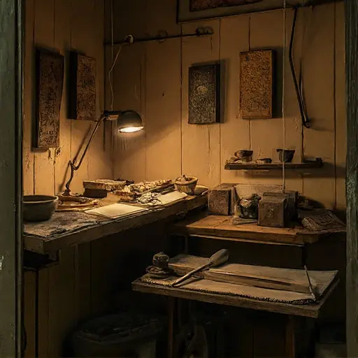 The Printmaking Studio wears a thin veil of ink-sweet stillness. The mounting table’s surface, polished by years of brushing prints into place, holds one sheet misaligned by barely a breath. A brush rests bristle-down, its lacquered handle bearing a fresh smudge.