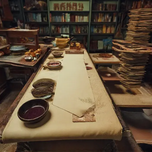 Nearby, a dish of paste-water has cooled, forming a dull ring around its rim. Nothing is shattered or spilled; instead, the quiet feels weighted by an interrupted thought—something reconsidered in silence and left floating between tools and paper fibers.