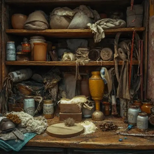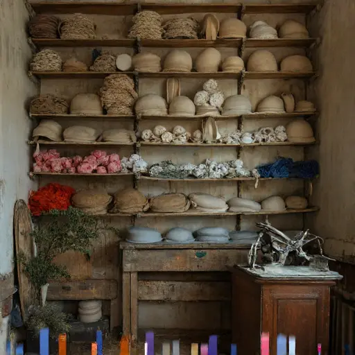 Behind stacked linens rests a returned note—“irregular shape.” A half-trimmed brim shows faint score marks where she tried to realign it. The stool stands crooked, angled toward the passage as though she rose repeatedly in restless reconsideration. A feather dye pot sits open, its rim stained unevenly. A spool of thread has rolled into the corner, its line trailing across the tiles in a subtle curve of hesitation.