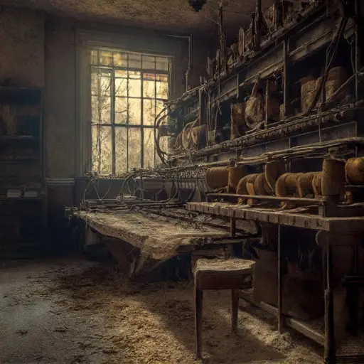 Gossamer-Fell House was an architectural contradiction: a mansion built of heavy, dark brick, yet featuring entire upper floors constructed of light, delicate wooden frameworks and glass. Its name suggested the combination of fine, ethereal thread and a solid, weighty drop. The house sat low in a valley, where the air was perpetually humid and cool. Upon entering the main workshop, the air was immediately thick, dry, and carried a potent, almost dusty scent of raw cotton, wool grease, and old machine oil. The floors were rough, uneven wood, scarred by heavy machinery. The silence here was profoundly unsettling, the complete absence of the relentless, rhythmic clatter and thump of the looms that once filled the space. This abandoned Victorian house was a factory of fragility, designed to create beauty, but ultimately consumed by its own delicate nature.