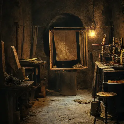 The vault hums with a subdued, papery quiet. The hanging lamp’s wick has burned to a nub, staining the ceiling with a smoke blossom. A quire of folded signatures lies splayed open, thread dangling as though mid-stitch.