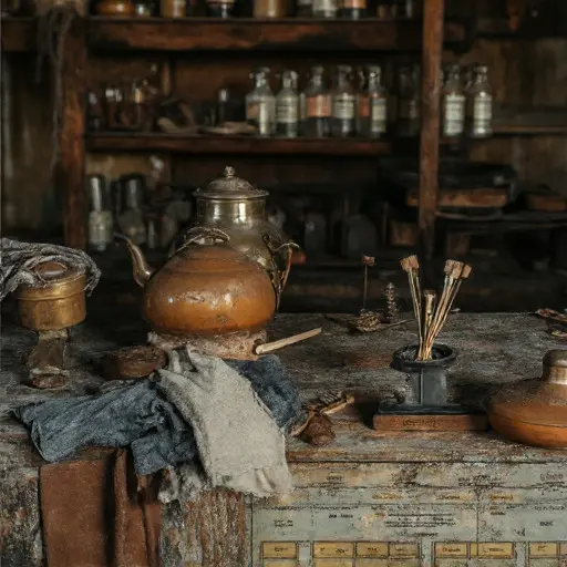 On a central bench, brass wheels and pinions are aligned by size; screwdrivers rest neatly on a leather roll. A partial movement sits in a vice, partially greased, with a tweezers nearby. A ledger tucked beneath a folded cloth notes finished orders in crisp columns. A small pouch of watch jewels, tiny and glimmering, sits beside a blotched blueprint, reflecting Erik’s habitual precision.