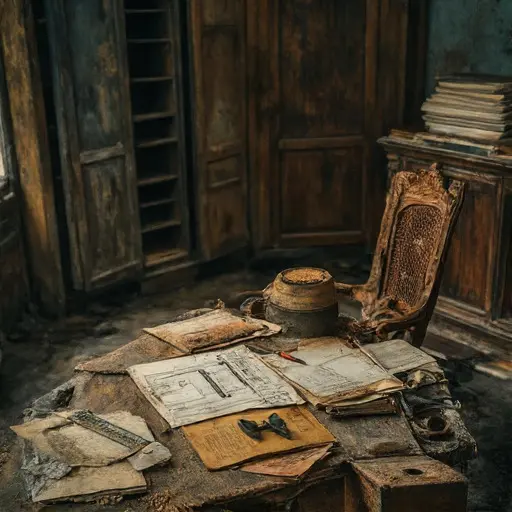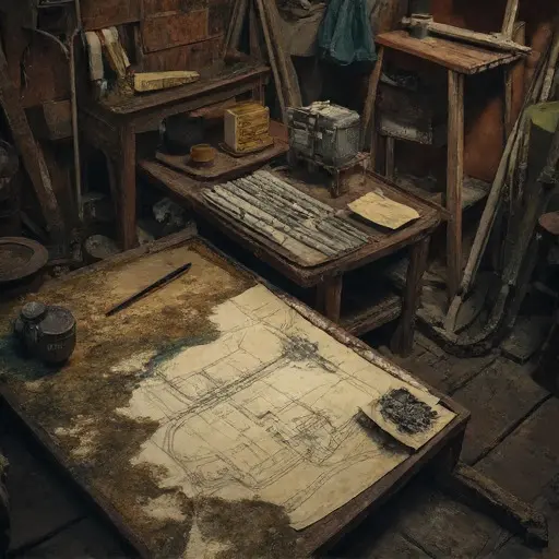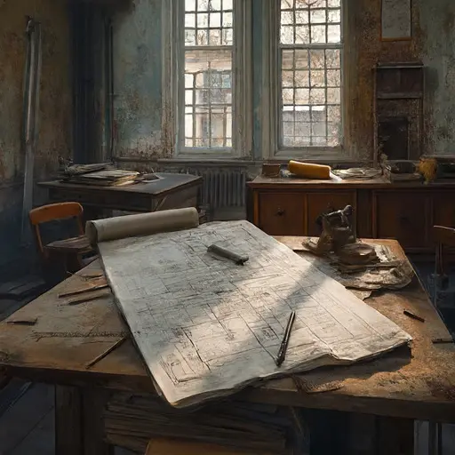 Drafting tables hold partially drawn blueprints and scattered tools. Compasses, rulers, ink pens, and drawing weights lie stiff with dust. Shelves of completed plans rest nearby. Yuri’s ledger, weighed down by a heavy lead weight, details client names, project notes, and design specifications. Dust settling over implements emphasizes abrupt cessation of repeated, precise gestures, silence accentuated by half-finished plans and displaced instruments.