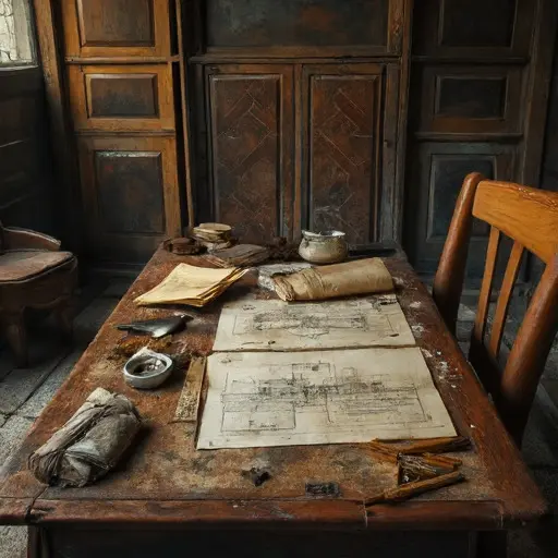 Tables hold partially drawn plans and scattered instruments. T-squares, compasses, ink pots, and rulers lie stiff with dust. Rolled plans rest nearby. Mikhail’s ledger, weighed down by a drafting triangle, details client names, project notes, and building instructions. Dust settling over implements emphasizes abrupt cessation of repeated, precise gestures, silence accentuated by half-drawn structures and displaced tools.