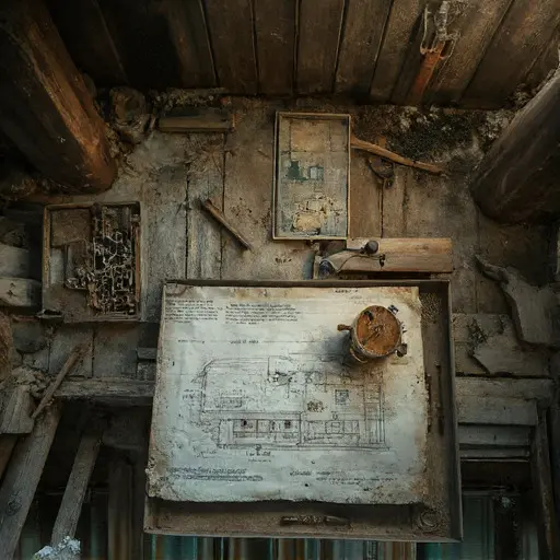 The Architect’s Loft hums in paused geometry. On a table, penciled blueprint annotations trail off abruptly. Every ruler, compass, and pencil embodies precise labor abruptly halted, the rhythm of design suspended in quiet stillness.