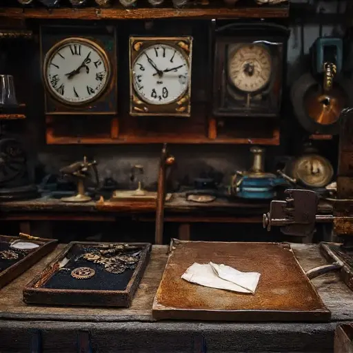 On the primary bench, screwdrivers and tweezers are aligned by size. Tiny gears and mainsprings rest in labeled compartments. A tray of partially assembled dials shows meticulous numbering. A ledger tucked beneath a brass weight records service dates and fees, each column precisely measured. A set of unfinished escapements leans against a corner, patiently awaiting completion.