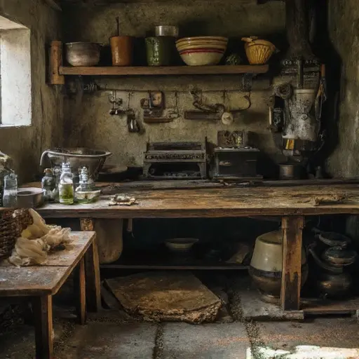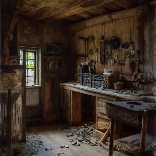 Along a trestle bench, powdered rouge rests in a small ceramic dish. A weighted timing fork lies beside a ledger of service intervals. Drawer inserts hold neatly filed pallets and pinions, each wrapped in linen. A tall-case pendulum, removed for cleaning, leans upright with habitual care, its brass bob dulled but centered.
