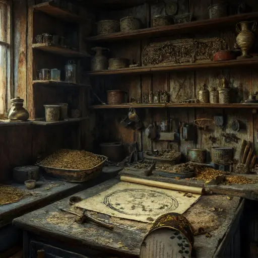 On the workbench, a partially finished cartouche shows ornate initials with decorative borders, incomplete at the corners. Trays of gemstones are arranged by color and size, yet remain untouched. Dust has settled into the grooves of tools and molds, preserving the moment labor ceased. Tiny filings glimmer faintly beneath the bench, marking halted work. Loupe and gravers remain precisely positioned, frozen in readiness, as if awaiting the artisan’s next careful touch.