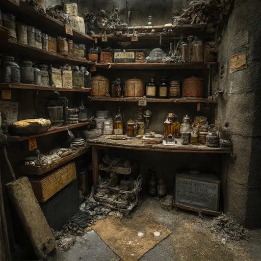 The Apothecary Lab resonates with suspended ritual. Here, the compendium recorded every preparation: infusions, distillations, and extractions. Tools remain mid-use, jars half-filled, and balances left unweighed.