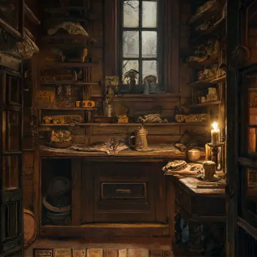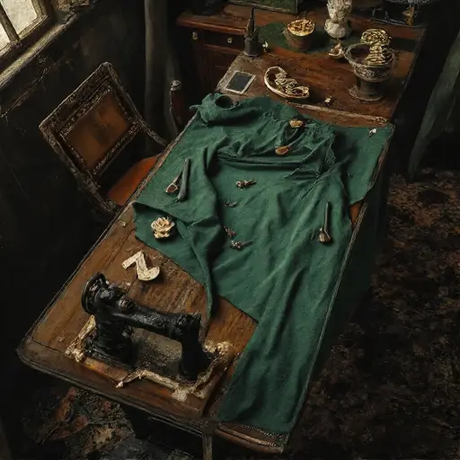 Clues from the furnished interiors evoke Edgar Lionel Davenport, born 1871 in Manchester, trained in modest draperies where precision was a quiet creed. In the Pattern Alcove, folded muslin drafts labeled in English script rest atop wooden slopers. His shears—heavy Sheffield steel—reflect years of dutiful service. Along a narrow shelf lie bundles of tailor’s canvas, each tagged with careful measurements, speaking of a man who worked with a disciplined calm, attentive to the subtle geometry of garments.