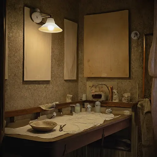 Faint disturbances settle through adjacent rooms. In the Upper Washstand Chamber, a cracked soap dish holds chalk-smudged water, as though Edgar rinsed his hands with undue haste. A letter from Leeds, its seal broken, lies untouched—perhaps carrying a cancelled commission or overdue payment. On the Guest Cot, a travel coat wraps only a tailor’s awl and a torn swatch book, insufficient for travel yet oddly curated.
