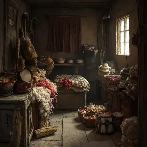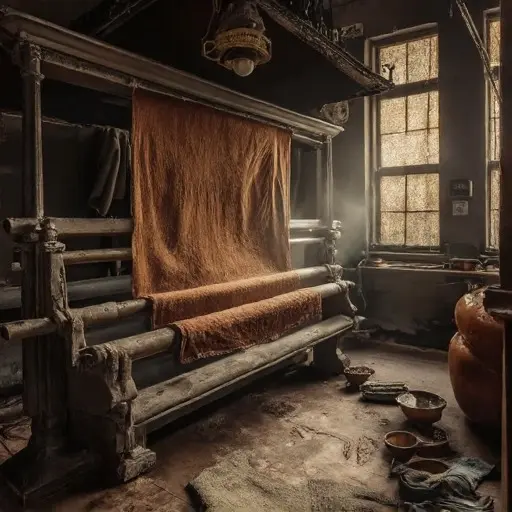 The mangle room smells of iron, turmeric, and faint vinegar. Lanternlight catches threads stretched in interrupted tension, echoing a rhythm that once steadied each motion.