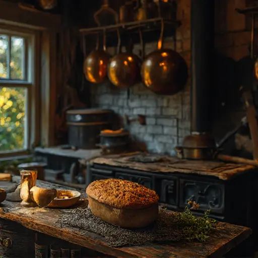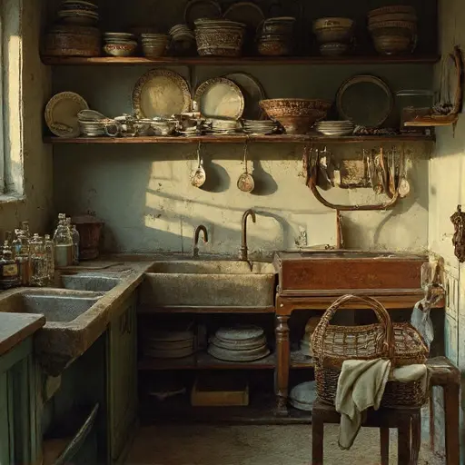 Clues across the interior unveil Máire Catherine Finnegan, born 1874 in County Clare, a respected cook who once served a modest landowning family. Her profession reveals itself in the ordered copper pans dangling in the Kitchen, the meticulous notches on a rolling pin for measuring pastry widths, and a tin of imported tea suggesting quiet pride in small luxuries. Her training appears in the precision of her herb bundles, labeled in Gaelic script, and the steady routines implied by a soot-kissed apron draped over a chair.