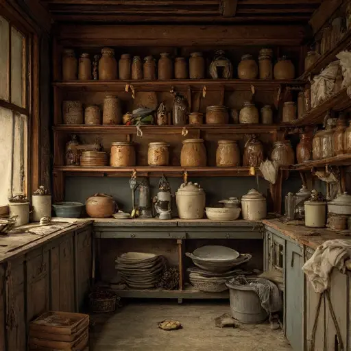 A stovepipe in the Pantry angles awkwardly toward the ceiling, its blackened rim framing a pause that no one explains. From the grooves worn into the long counter to the faint aroma of beeswax on linens, the room stands fully furnished yet emotionally vacant. A wooden spoon left inside a mixing bowl hints at interrupted preparation.