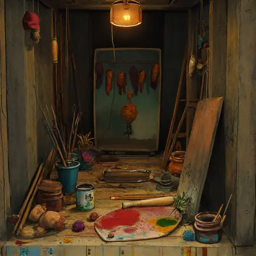 A muted hush clings to the cramped nook. On the central bench lies a puppet torso, its left side carved cleanly, its right side bearing hesitant gouge marks edging into rough uncertainty. A brush loaded with ochre rests against a palette where color has dried mid-blend.
