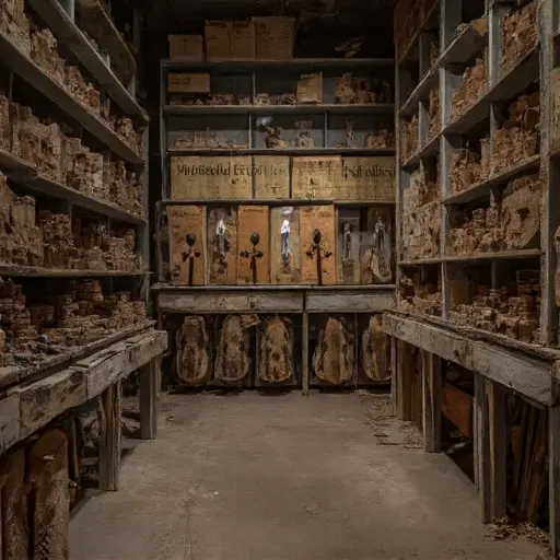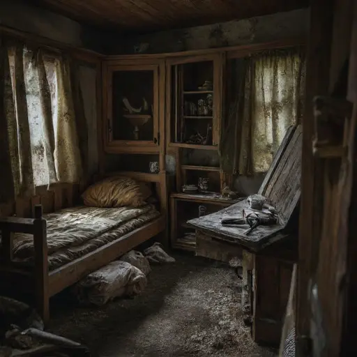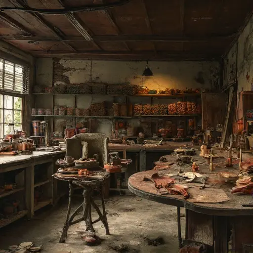 Wood pieces and half-assembled instruments lie untouched. A ledger beneath the main bench lists orders and carving steps but ends abruptly. Dust covers tools, varnish jars remain sealed, and chisels rest across folded cloths, poised for the next stroke that never came. Small shavings cling to the benches, frozen in their final curl, instruments suspended mid-creation.