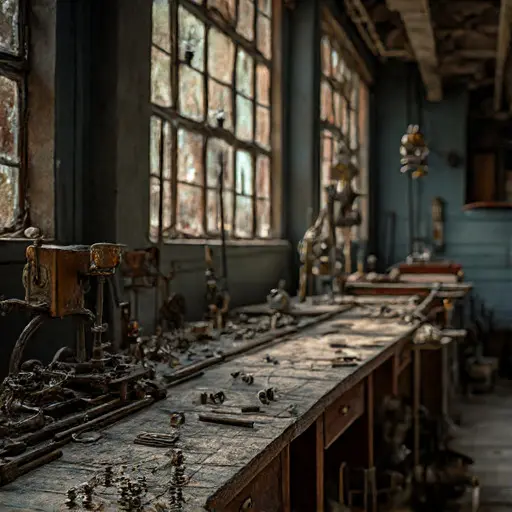 The workshop exudes quiet precision. On the central bench, the ledger lies open with partially drawn schematics, screwdrivers and tweezers left in mid-motion, and unfinished clock cases arranged as if recently handled. Every surface bears the faint imprint of hurried, interrupted labor, the quiet nearly tangible, resonating with the lost rhythm of mechanical work.