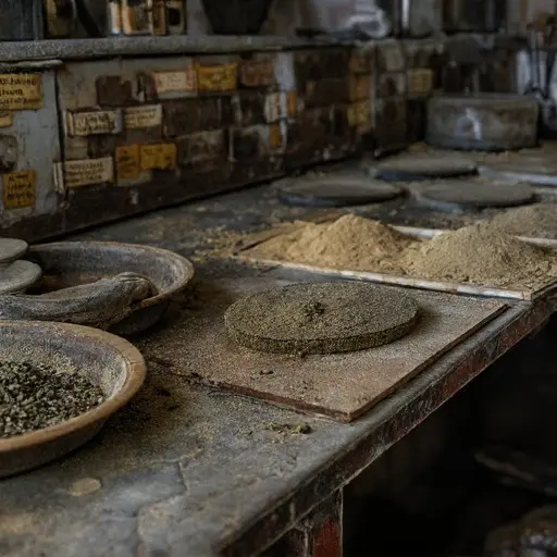Counters hold partially measured herbs and scattered glassware. Mortars, pestles, balances, and droppers lie stiff with dust. Shelves of tinctures and powders rest nearby, labels faded. Edmund’s ledger, weighed down by a brass mortar, details client names, mixtures, and instructions. Dust settling over implements emphasizes abrupt cessation of repeated, precise gestures, silence accentuated by half-prepared remedies and displaced jars.