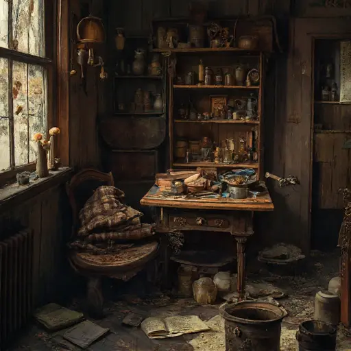 The house remains abandoned, herbs, vials, and tools awaiting hands that will not return, the quiet heavy with unfinished alchemy and lost mastery.