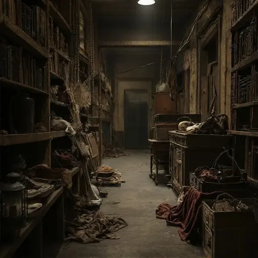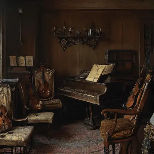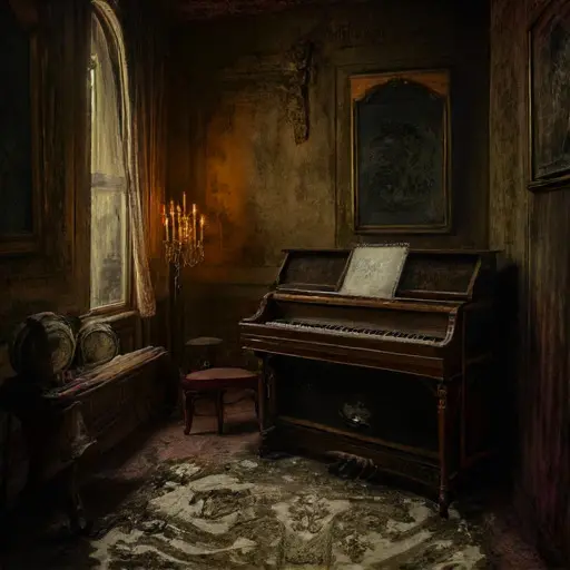 Dust lies softly over the music room, gathering in corners as if listening for a final chord. The once-vibrant rugs, woven in Florentine patterns, now fade beneath scattered pages of exercises and half-legible drafts. A faint scent of old varnish and lamp oil rises from the piano’s cracked soundboard.