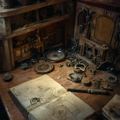 Later ledger entries reveal incomplete mechanisms; some gear trains remain misaligned, balance wheels unfinished. Margin notes—“client delivery delayed”—are smudged. Tools lie scattered; half-assembled clocks teeter on shelves. Miklós’s precision faltered under worsening arthritis and failing eyesight, leaving work suspended and loft routines indefinitely frozen. Each abandoned gear and sketch embodies halted intention and interrupted expertise.