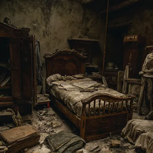 The house remains abandoned, its workbench, gears, and diagram sheets a quiet testament to interrupted clockmaking and unresolved devotion.