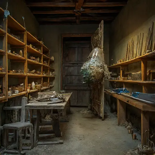 A quiet, methodical stillness fills the Loft, where pendulums hang motionless and screwdrivers lie idle. Each tool, gear, and sketch implies meticulous routines suddenly halted, leaving the space suspended between design and motion.
