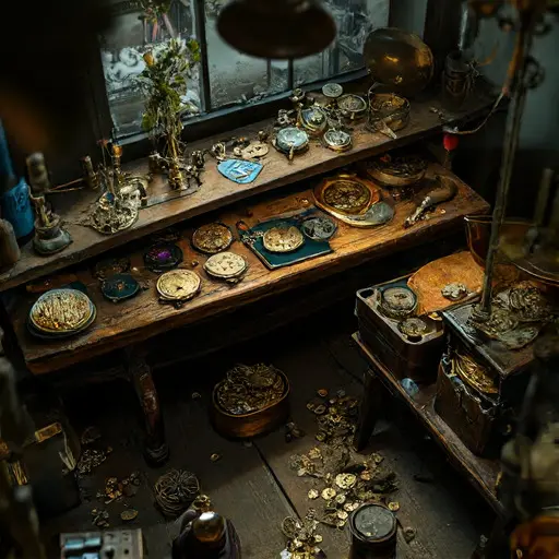 Yet hairline disturbances crept in. A mainspring barrel is scuffed as though slipped. One tray of screws sits off-center, its sizes mismatched. His ledger of repairs shows neat columns turning tense—one client’s name scratched out, another rewritten. A loupe lies overturned, lens rim cracked ever so slightly. These small ruptures point toward strain: too many high-value commissions, or disputes over a rare escapement he was asked to reconstruct.