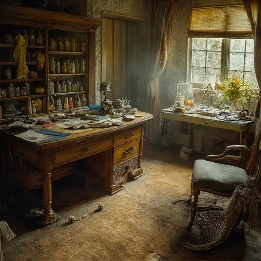 The house was his whole world — a place of specimens, pressed flowers, and long unread volumes. The morning room holds the clearest evidence of his habits: an herbarium spread open across a table, tweezers still poised above a drying flower. Newspaper clippings pinned to the wall detail changes in railway lines, weather patterns, and botanical discoveries. A letter never sent reads: “There are none left to impress. The world has quite forgotten me, and I have returned the favor.”
