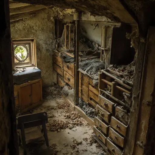 Down a narrow hall behind the servant stair lies the specimen room, a space not on the original floor plans. A hand-cut plaque above the door reads “Vita Brevis.” Within: rows of cabinets built floor to ceiling, drawers labeled with Latin names. The lower half of the room is intact — drawers still open to reveal pressed petals, pinned insects, and mineral samples in wax paper envelopes. But the upper shelves have collapsed, their contents spilled into a mess of glass shards, dried matter, and wooden frames.