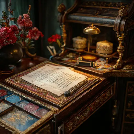 A hush settles over the Study Chamber, where the inlaid surfaces of the writing desk gleam faintly under the dim lamp. A reed pen balances across a shallow groove, poised over a half-finished flourish. Several sheets lie fanned on the floor, their edges curling as if dropped gently rather than flung.