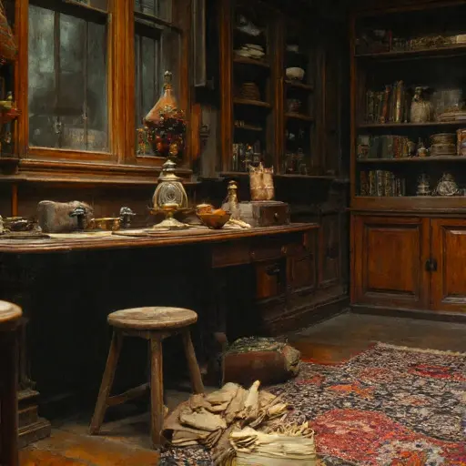 Trouble emerges in small, crafted corners. In the Upper Hall Cupboard, a cracked pigment dish leans against a folded note from a distant patron—its seal marred by moisture, its margins rippled as if read often. Near it, a jar of gum arabic appears coagulated, signaling a lapse in his once meticulous maintenance. On the Guest Cot, a travel cloak carries faint ink smudges along the hem, and a roll of export paper remains uncut, though marked for dispatch. Whether financial disappointment or waning eyesight encroached, the signs gather without raising their voice.