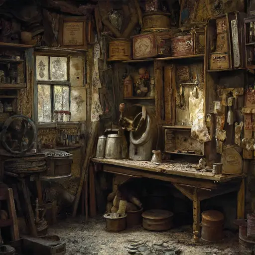 Back in the Press Room, everything circles the scattered rivet bowl. A few rivets roll near the table’s lip, glinting as if unsettled by a wavering hand. The half-shaped canister nearby bears a seam that bows inward—an error too slight for most to see but devastating for a tinsmith’s pride. Tin shavings cluster at the foot of the press table in an unfamiliar pattern, as though he shifted his stance repeatedly, uncertain of the next strike.